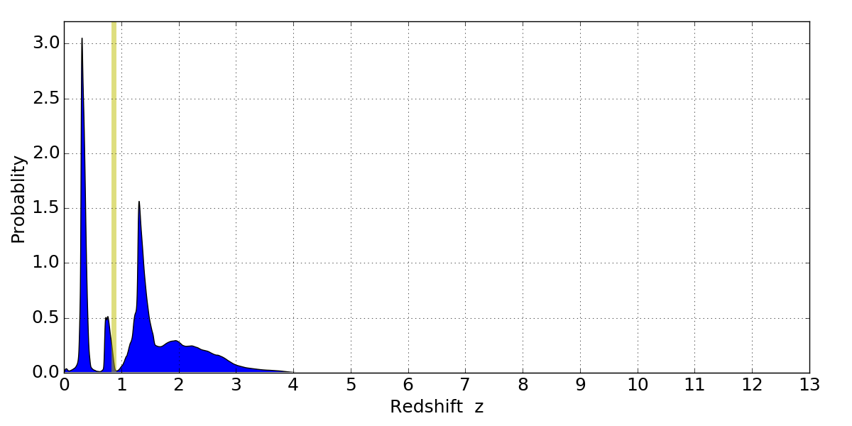 In P(z) plots: Yellow lines mark the cluster redshift z = 0.870,