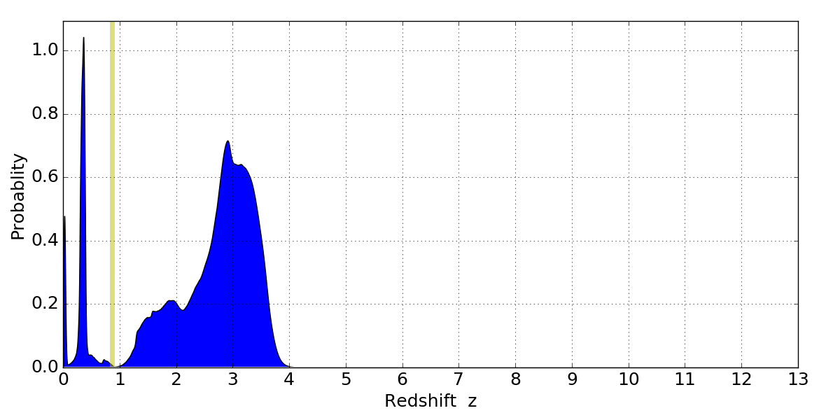 In P(z) plots: Yellow lines mark the cluster redshift z = 0.870,