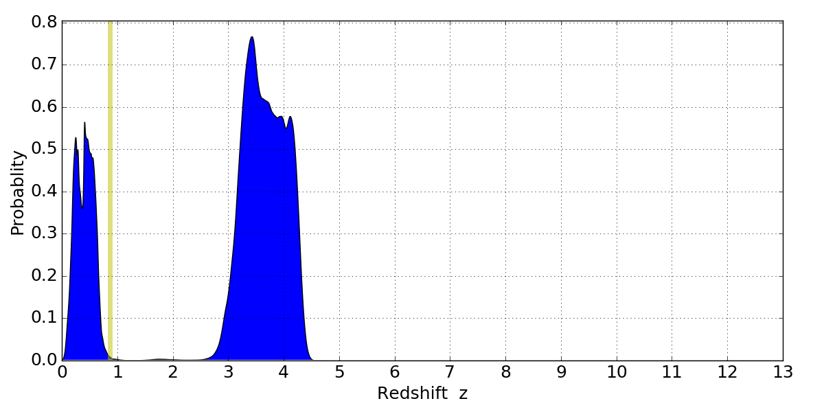In P(z) plots: Yellow lines mark the cluster redshift z = 0.870,