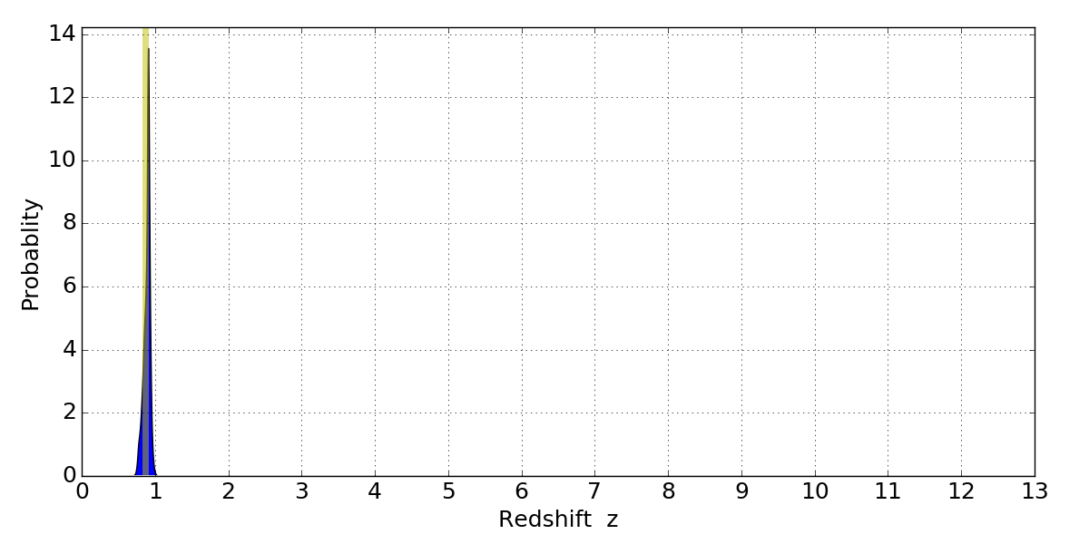 In P(z) plots: Yellow lines mark the cluster redshift z = 0.870,