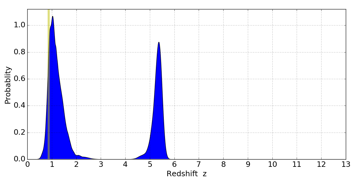 In P(z) plots: Yellow lines mark the cluster redshift z = 0.870,