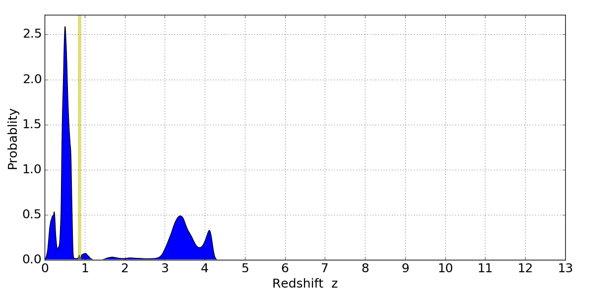 In P(z) plots: Yellow lines mark the cluster redshift z = 0.870,