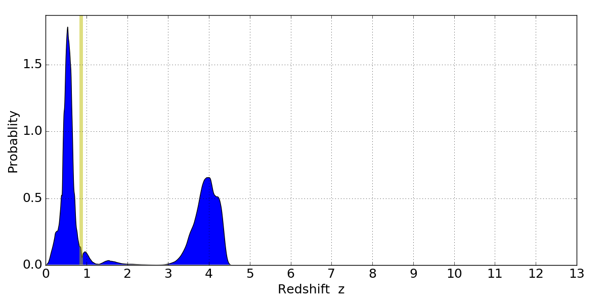 In P(z) plots: Yellow lines mark the cluster redshift z = 0.870,