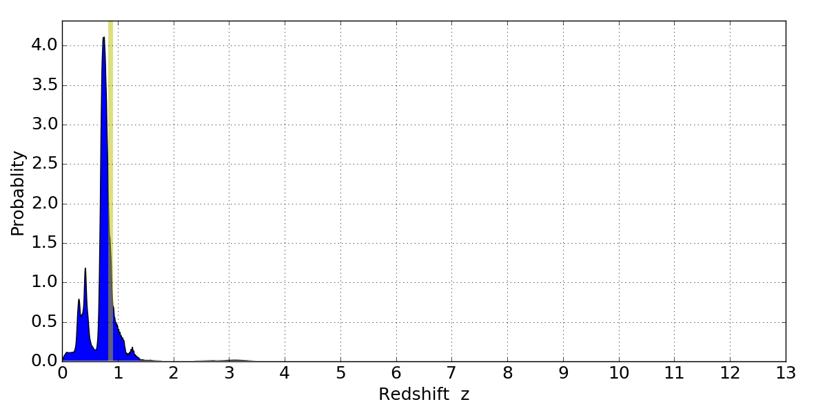 In P(z) plots: Yellow lines mark the cluster redshift z = 0.870,