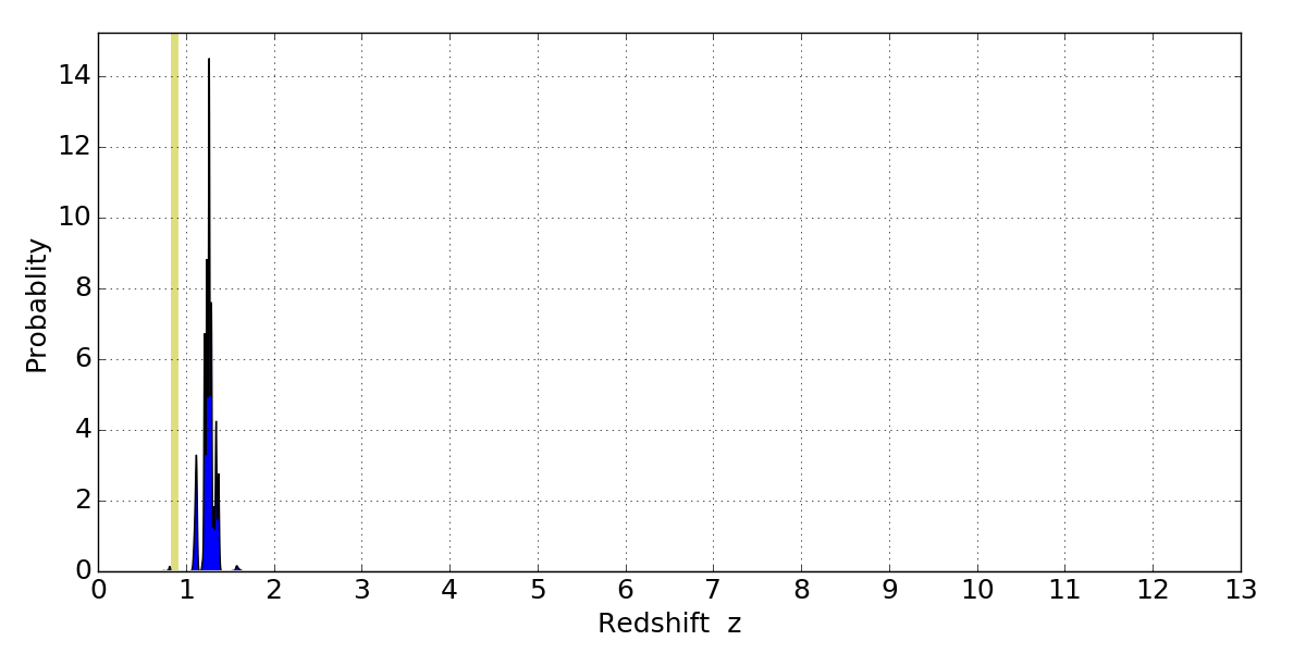 In P(z) plots: Yellow lines mark the cluster redshift z = 0.870,