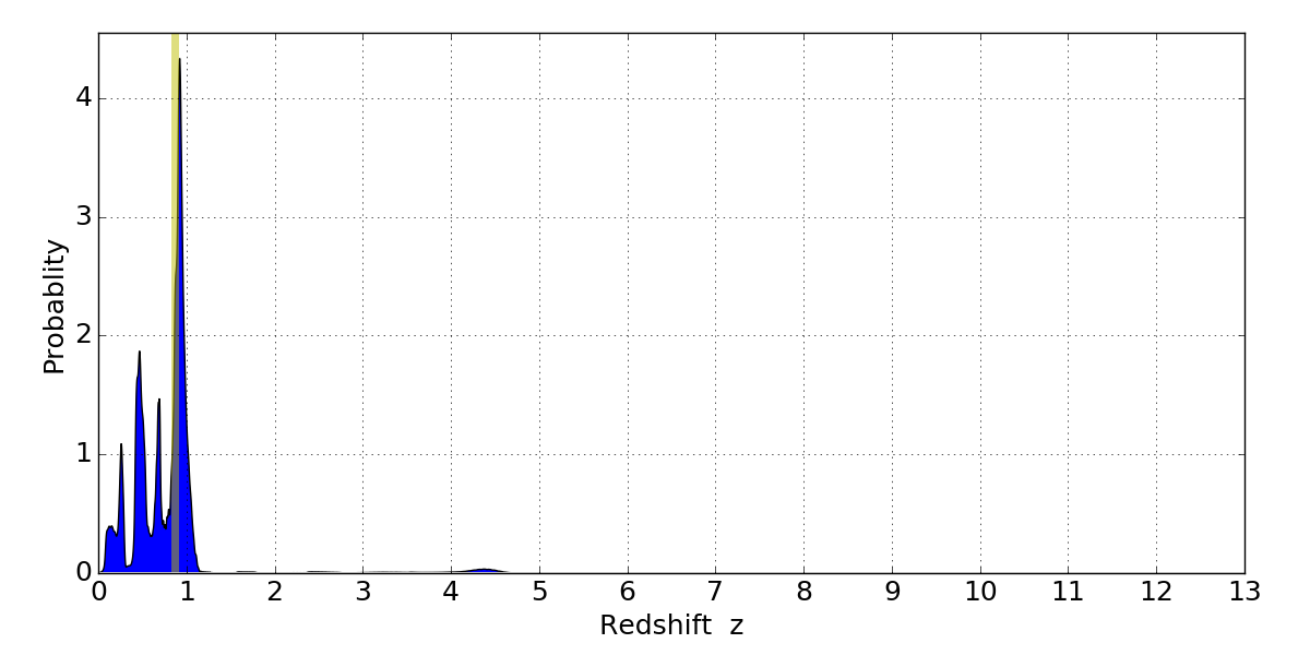 In P(z) plots: Yellow lines mark the cluster redshift z = 0.870,