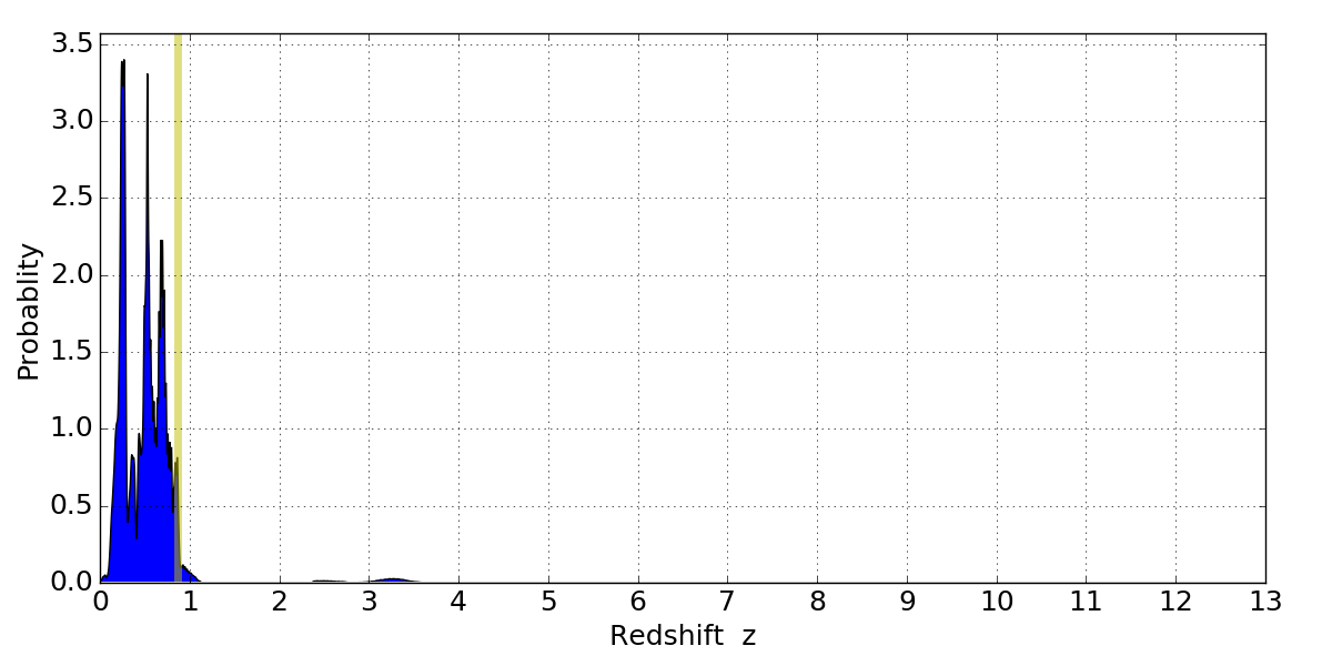 In P(z) plots: Yellow lines mark the cluster redshift z = 0.870,