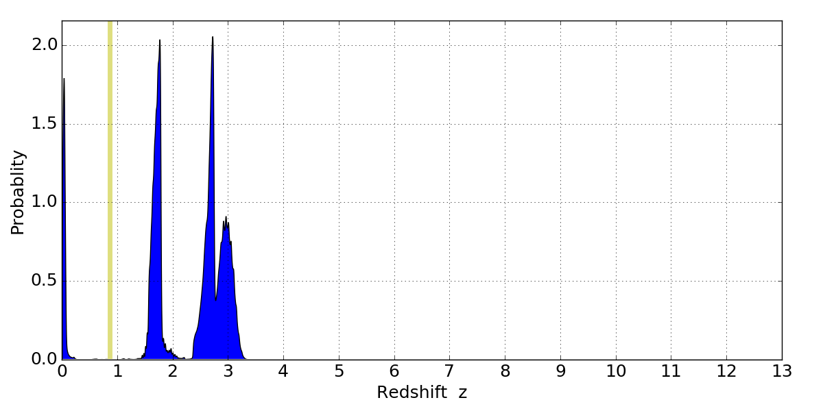 In P(z) plots: Yellow lines mark the cluster redshift z = 0.870,