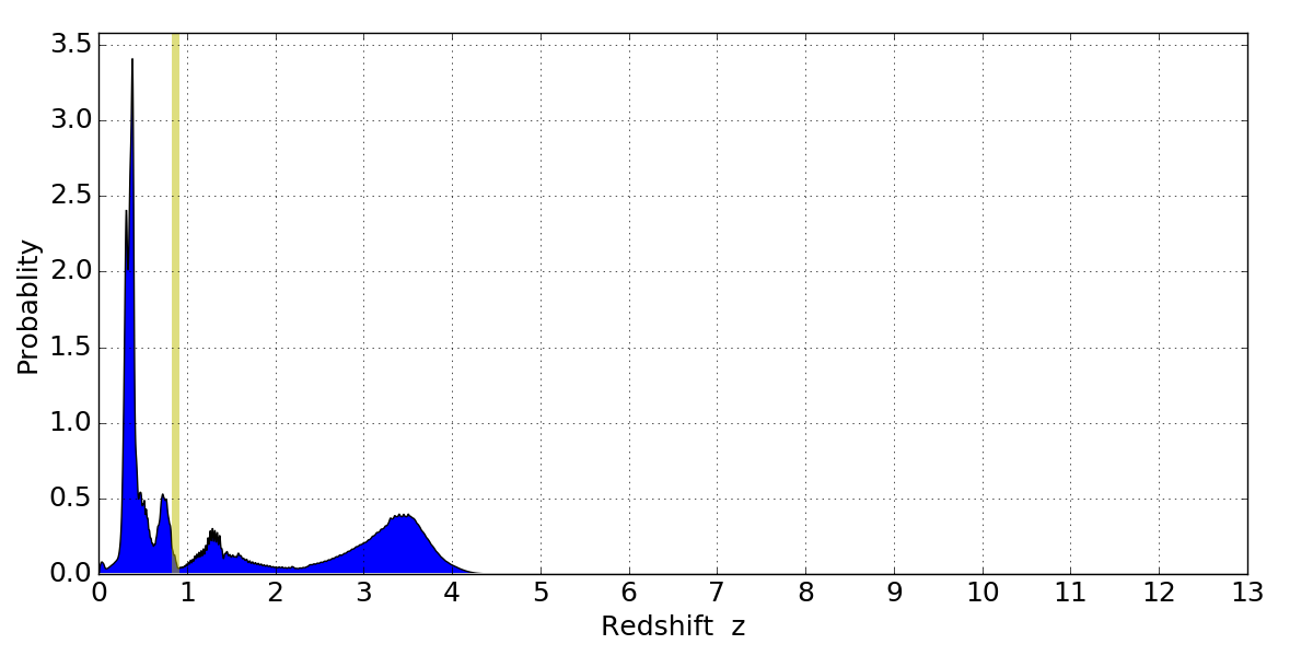 In P(z) plots: Yellow lines mark the cluster redshift z = 0.870,