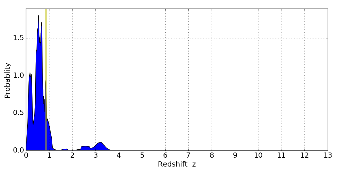 In P(z) plots: Yellow lines mark the cluster redshift z = 0.870,