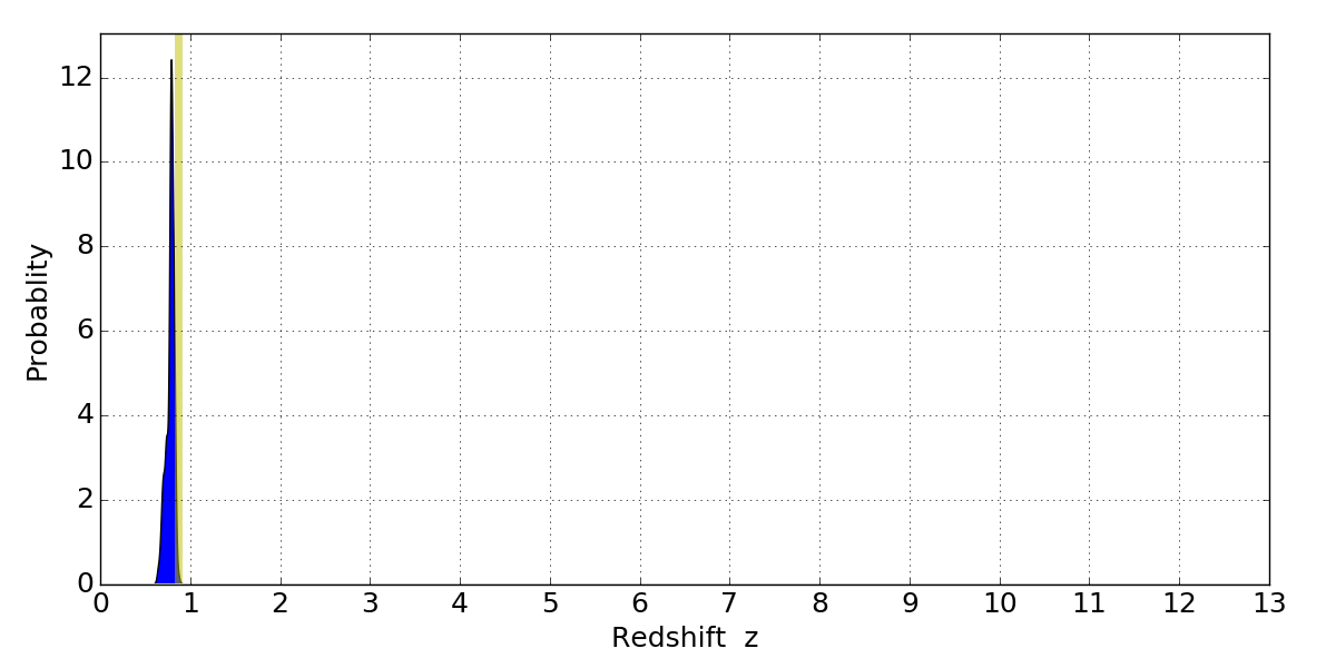 In P(z) plots: Yellow lines mark the cluster redshift z = 0.870,