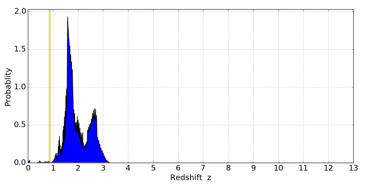 In P(z) plots: Yellow lines mark the cluster redshift z = 0.870,