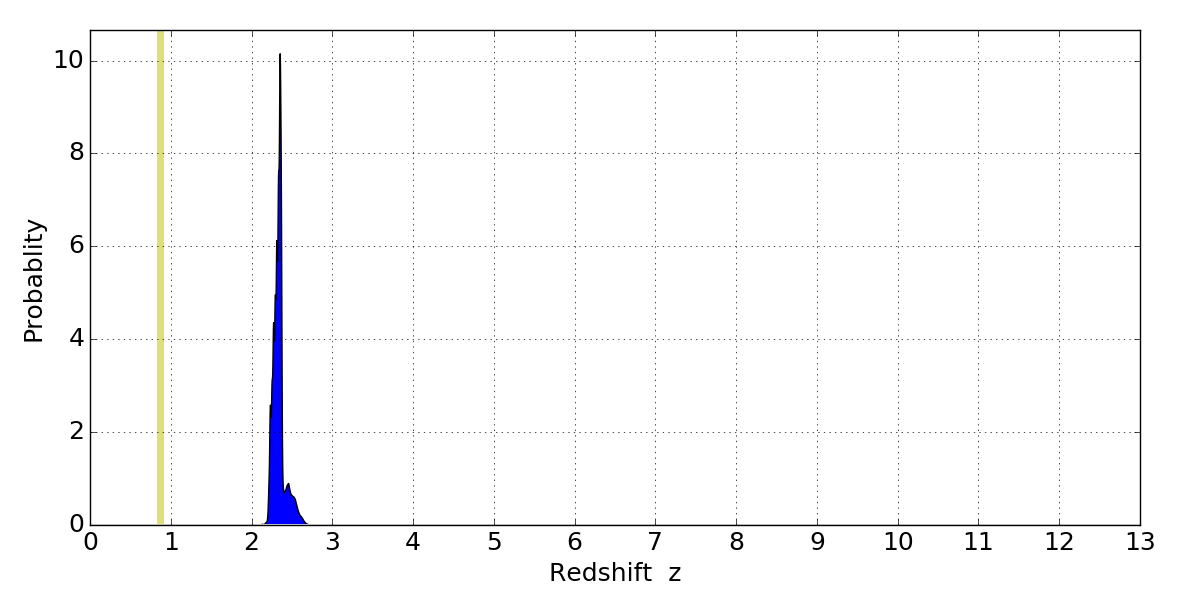 In P(z) plots: Yellow lines mark the cluster redshift z = 0.870,