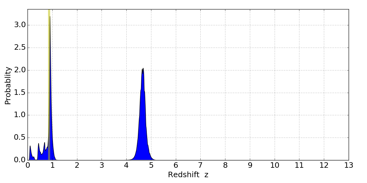 In P(z) plots: Yellow lines mark the cluster redshift z = 0.870,
