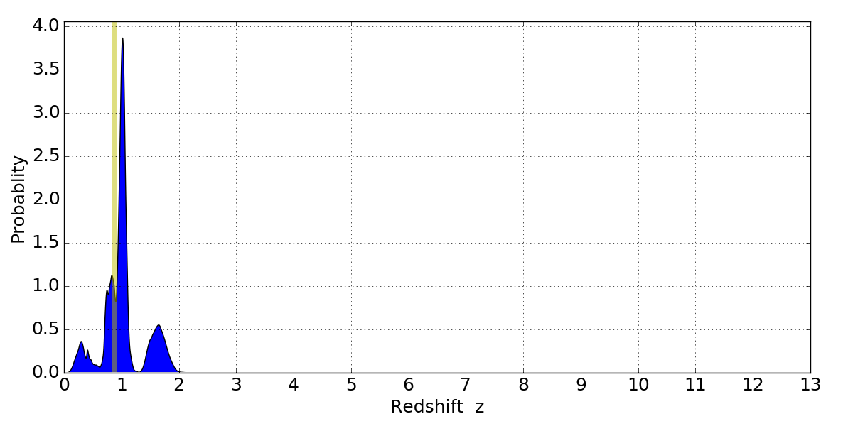 In P(z) plots: Yellow lines mark the cluster redshift z = 0.870,