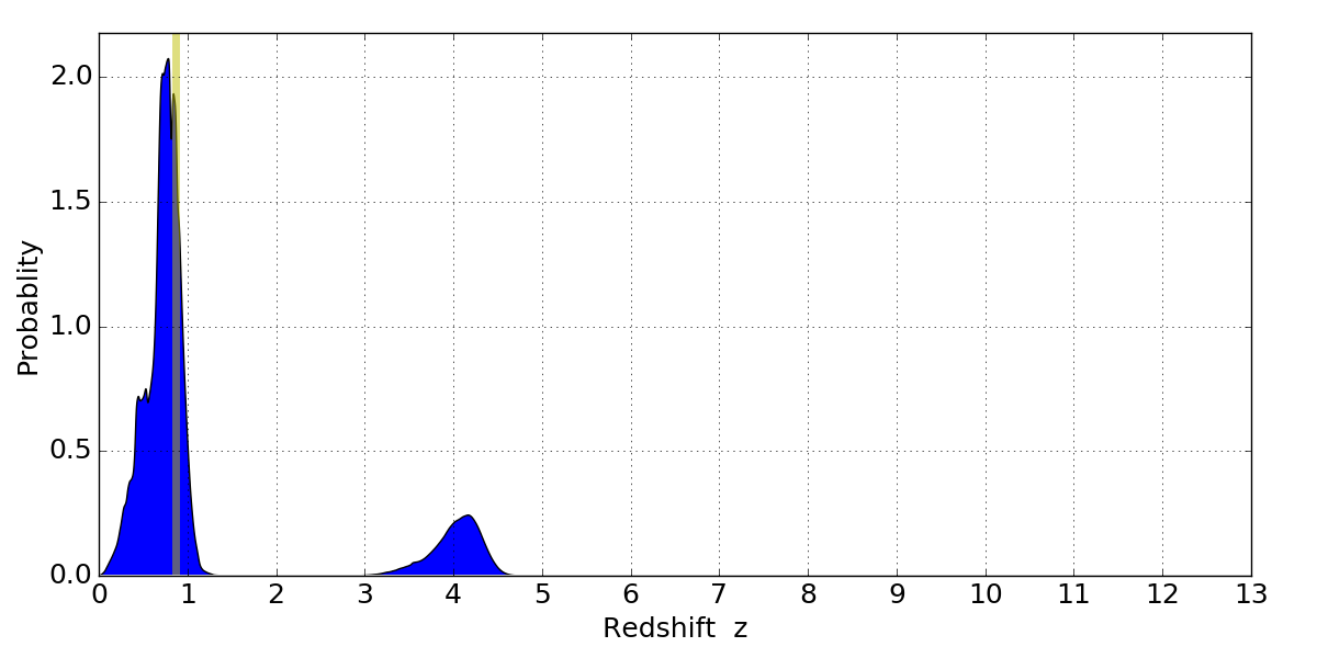 In P(z) plots: Yellow lines mark the cluster redshift z = 0.870,