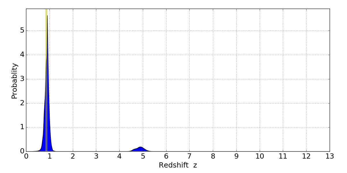 In P(z) plots: Yellow lines mark the cluster redshift z = 0.870,