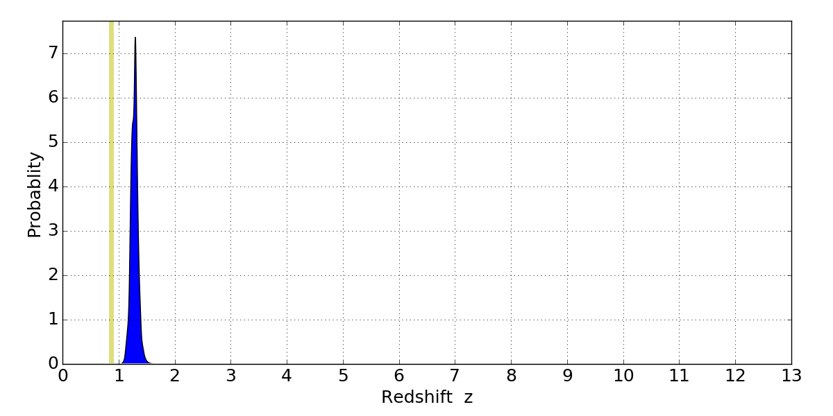 In P(z) plots: Yellow lines mark the cluster redshift z = 0.870,