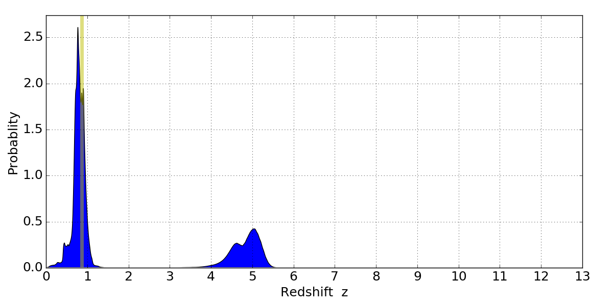 In P(z) plots: Yellow lines mark the cluster redshift z = 0.870,