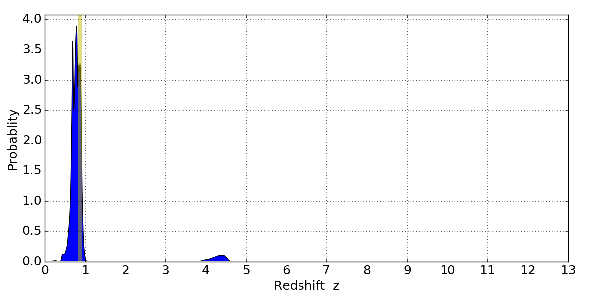 In P(z) plots: Yellow lines mark the cluster redshift z = 0.870,