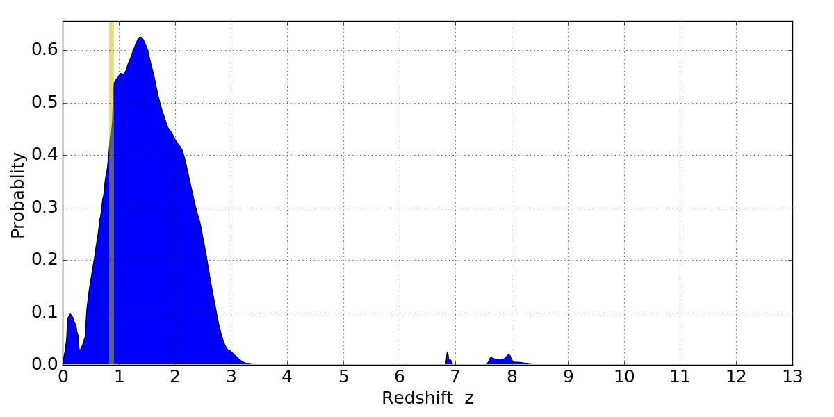 In P(z) plots: Yellow lines mark the cluster redshift z = 0.870,