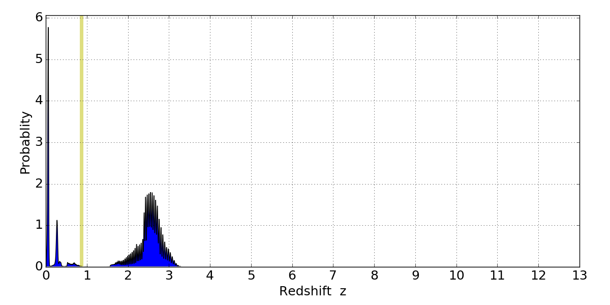 In P(z) plots: Yellow lines mark the cluster redshift z = 0.870,
