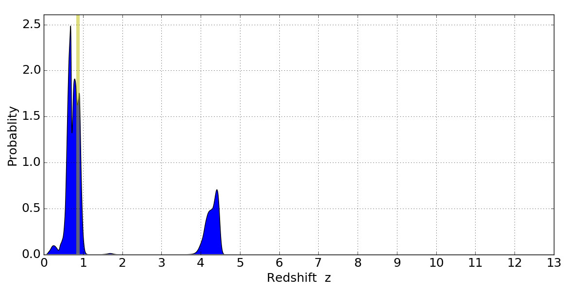In P(z) plots: Yellow lines mark the cluster redshift z = 0.870,
