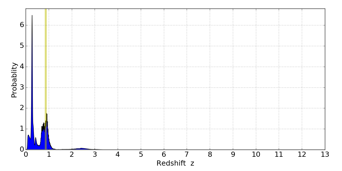 In P(z) plots: Yellow lines mark the cluster redshift z = 0.870,