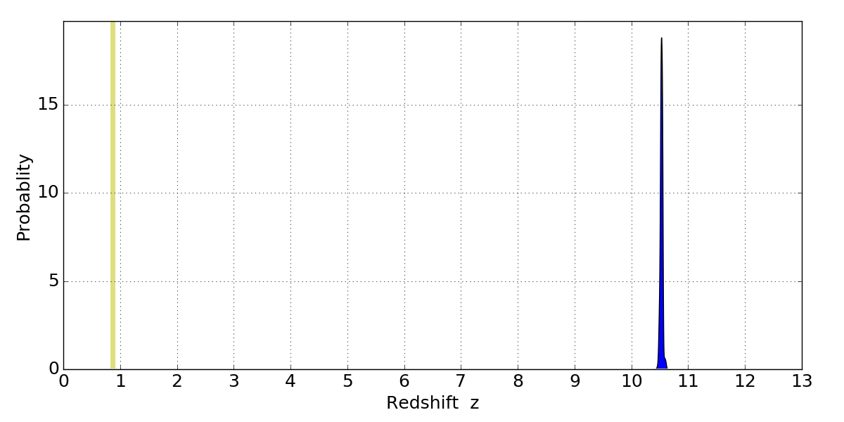 In P(z) plots: Yellow lines mark the cluster redshift z = 0.870,