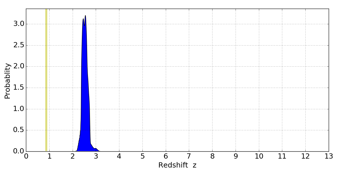 In P(z) plots: Yellow lines mark the cluster redshift z = 0.870,