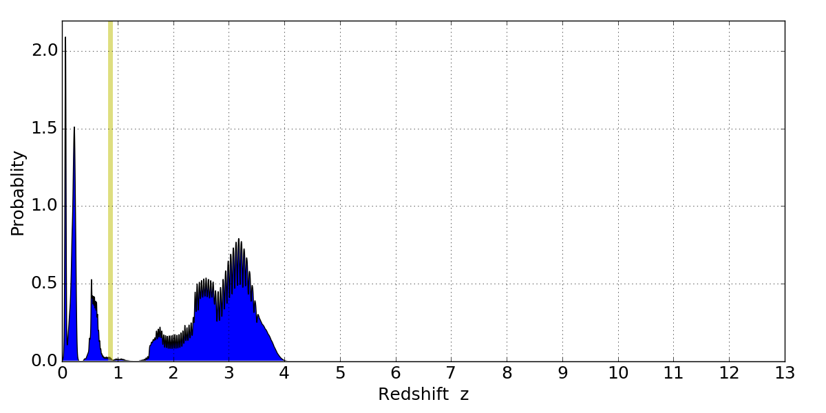 In P(z) plots: Yellow lines mark the cluster redshift z = 0.870,