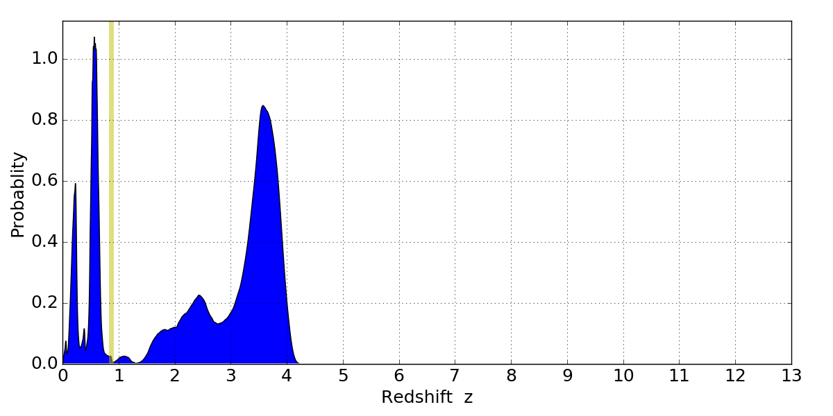 In P(z) plots: Yellow lines mark the cluster redshift z = 0.870,
