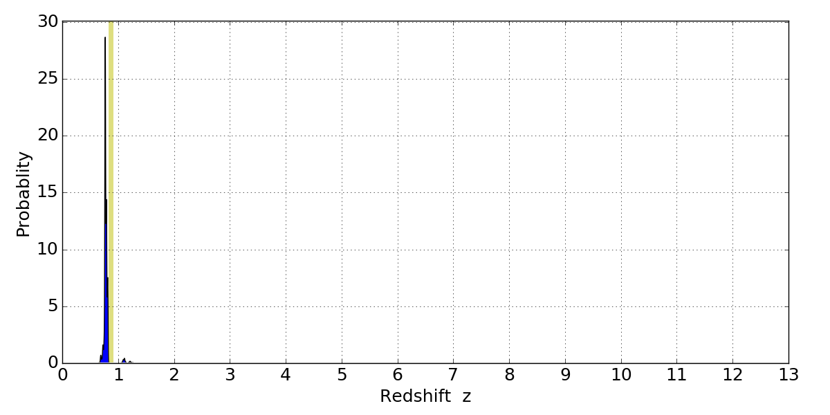 In P(z) plots: Yellow lines mark the cluster redshift z = 0.870,