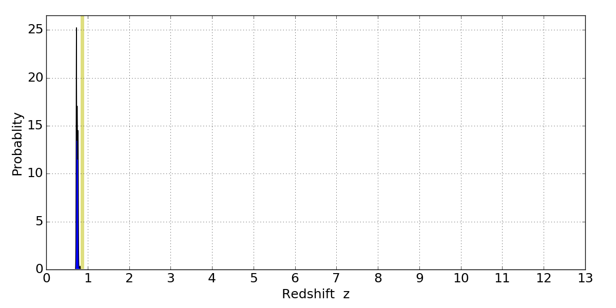 In P(z) plots: Yellow lines mark the cluster redshift z = 0.870,