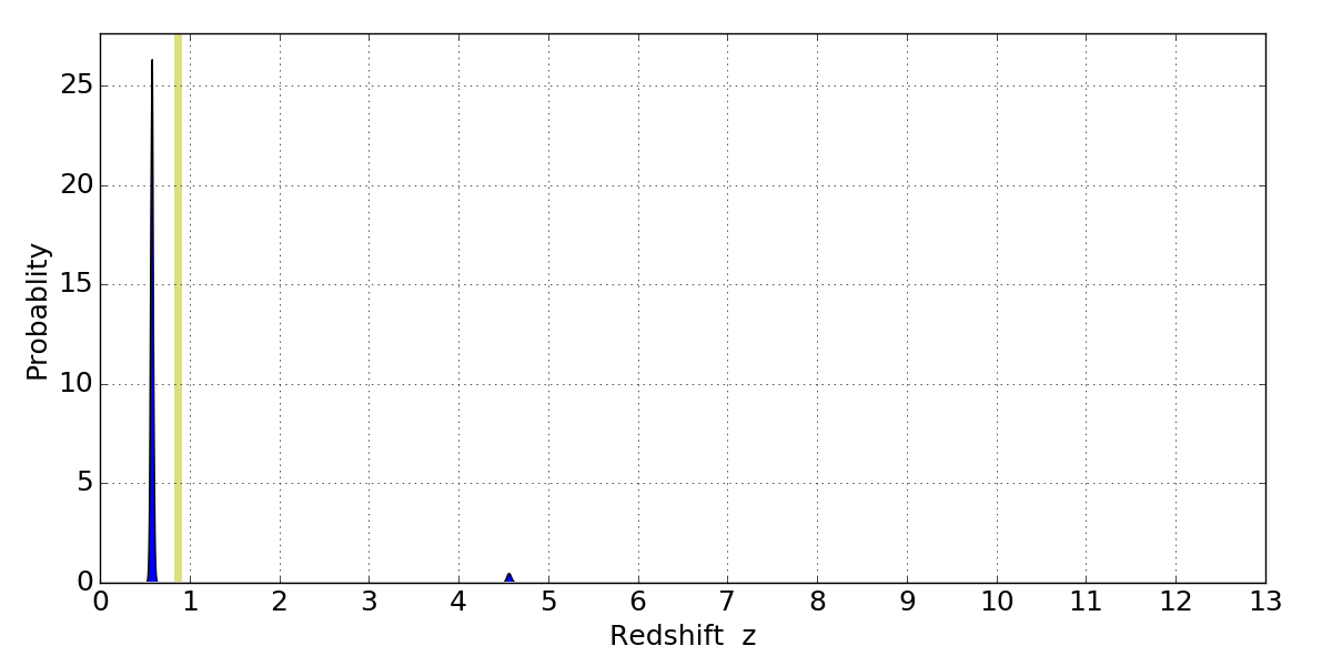 In P(z) plots: Yellow lines mark the cluster redshift z = 0.870,