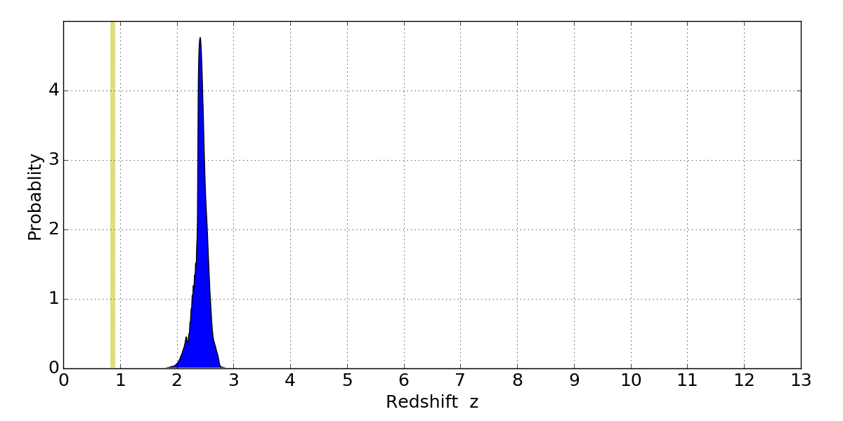In P(z) plots: Yellow lines mark the cluster redshift z = 0.870,