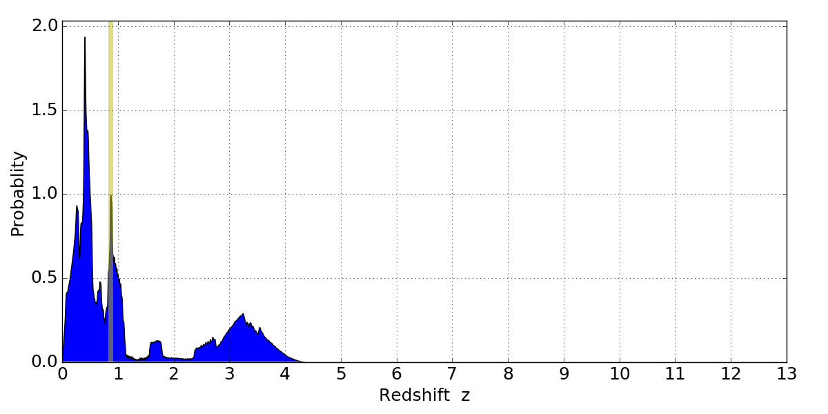 In P(z) plots: Yellow lines mark the cluster redshift z = 0.870,