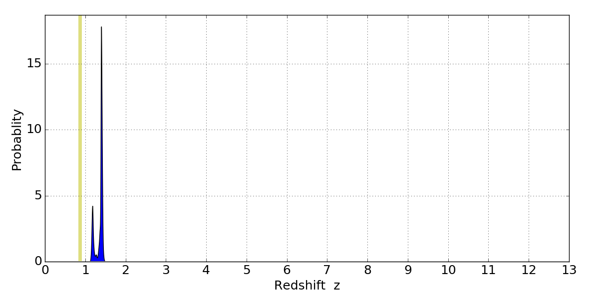 In P(z) plots: Yellow lines mark the cluster redshift z = 0.870,