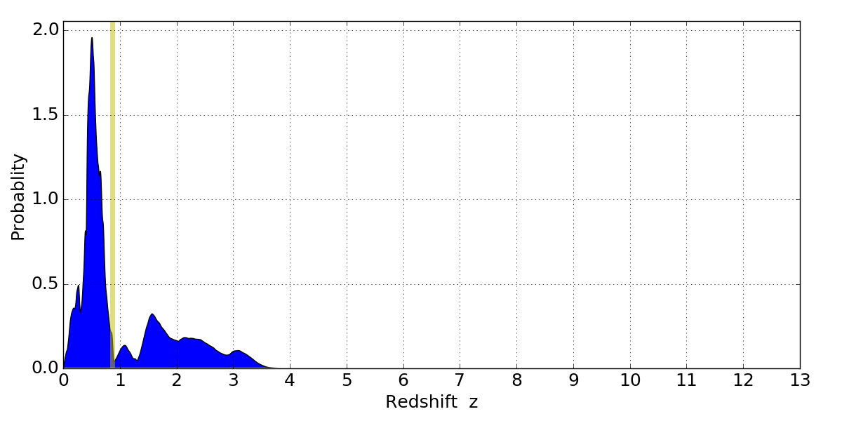 In P(z) plots: Yellow lines mark the cluster redshift z = 0.870,
