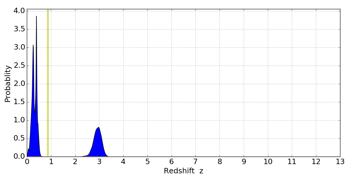 In P(z) plots: Yellow lines mark the cluster redshift z = 0.870,