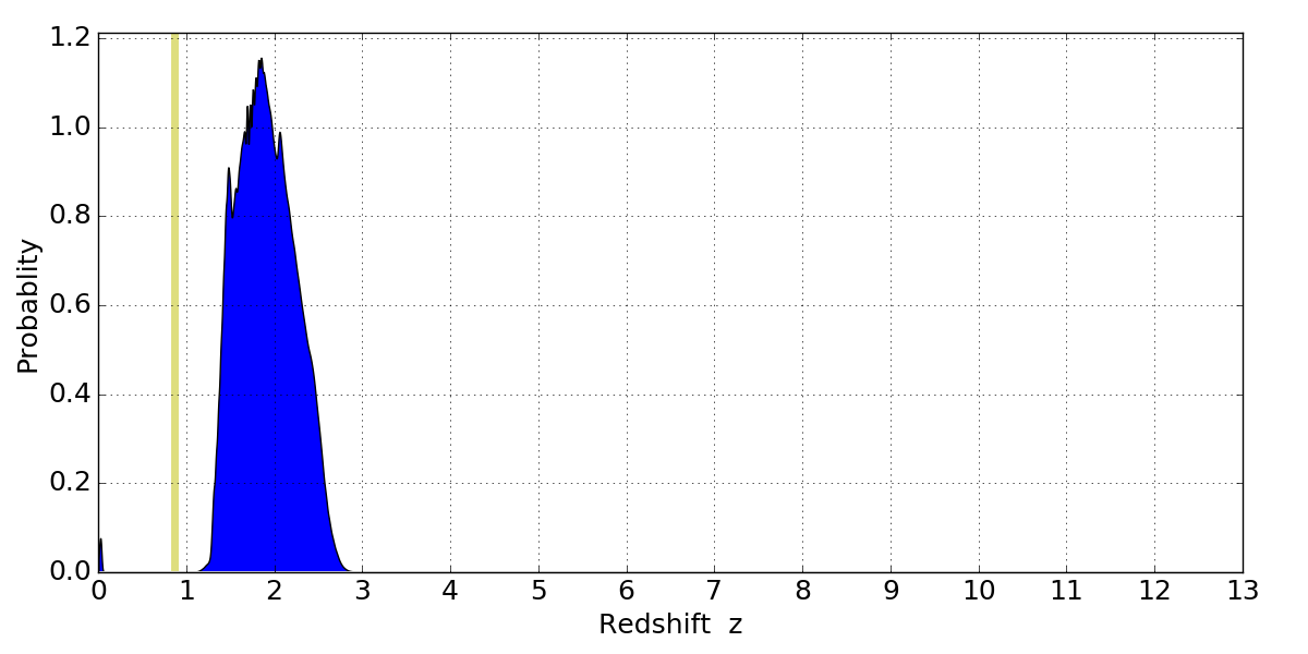 In P(z) plots: Yellow lines mark the cluster redshift z = 0.870,