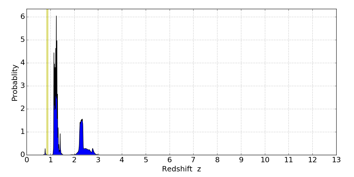 In P(z) plots: Yellow lines mark the cluster redshift z = 0.870,