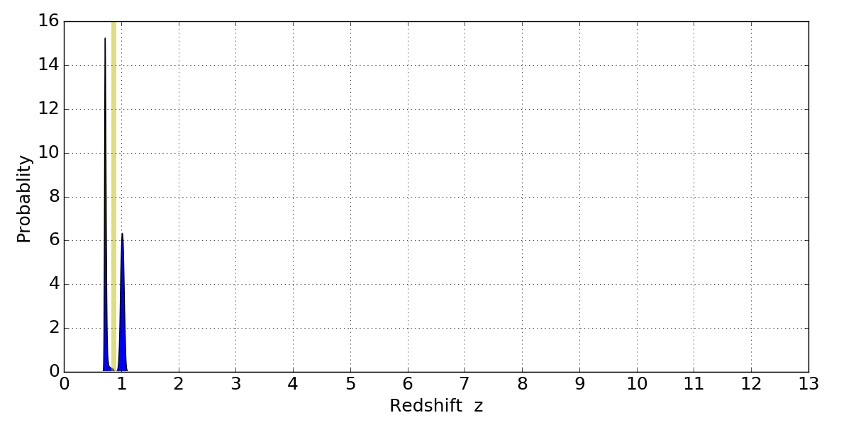 In P(z) plots: Yellow lines mark the cluster redshift z = 0.870,