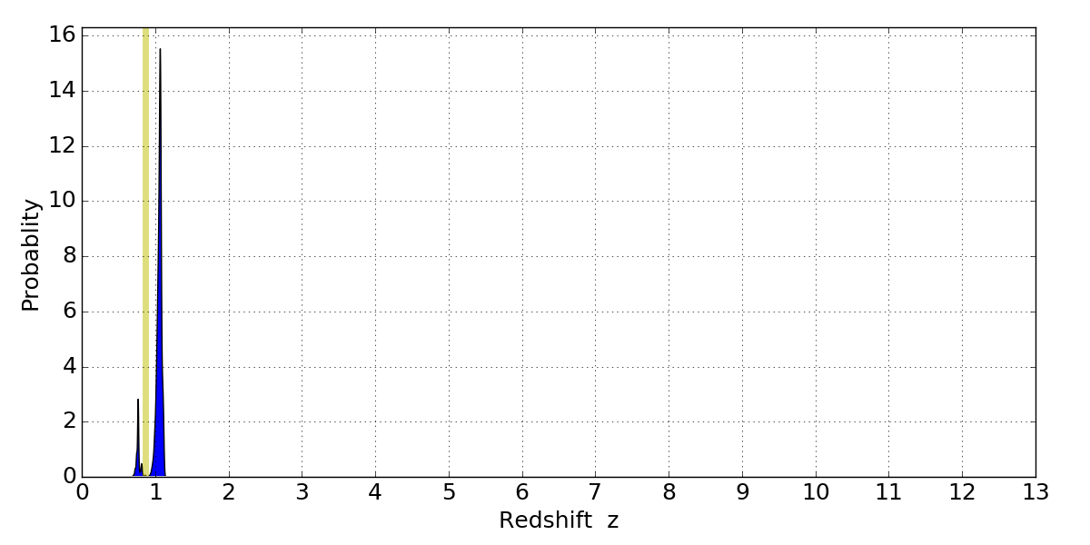 In P(z) plots: Yellow lines mark the cluster redshift z = 0.870,