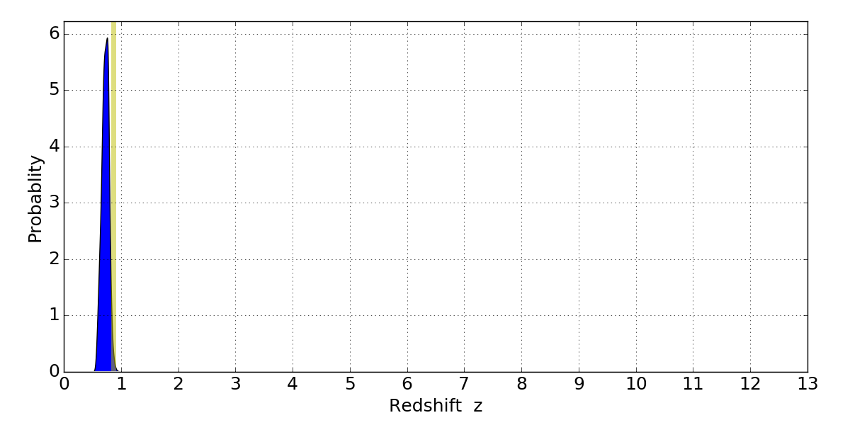 In P(z) plots: Yellow lines mark the cluster redshift z = 0.870,