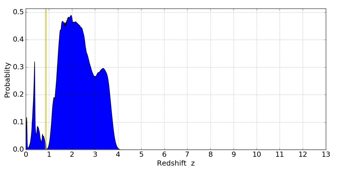 In P(z) plots: Yellow lines mark the cluster redshift z = 0.870,