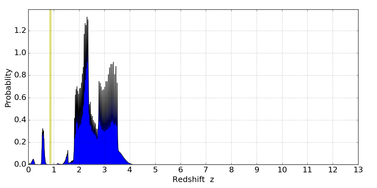 In P(z) plots: Yellow lines mark the cluster redshift z = 0.870,