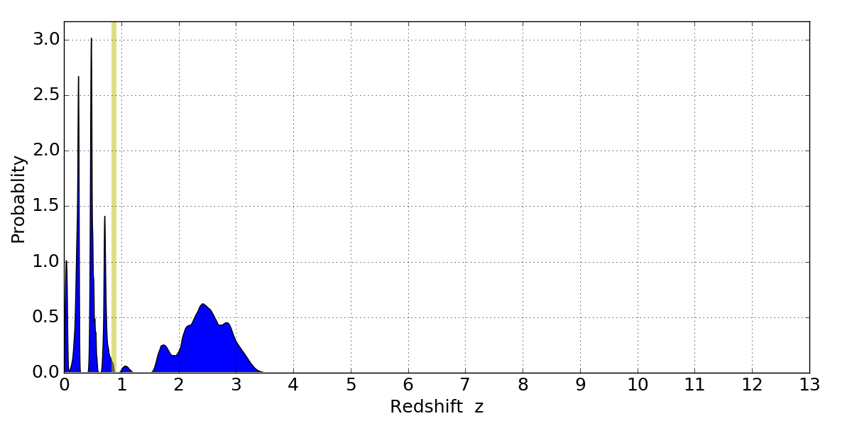 In P(z) plots: Yellow lines mark the cluster redshift z = 0.870,