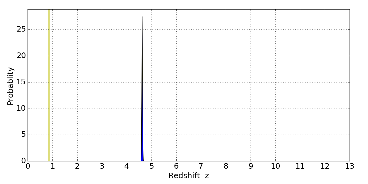 In P(z) plots: Yellow lines mark the cluster redshift z = 0.870,