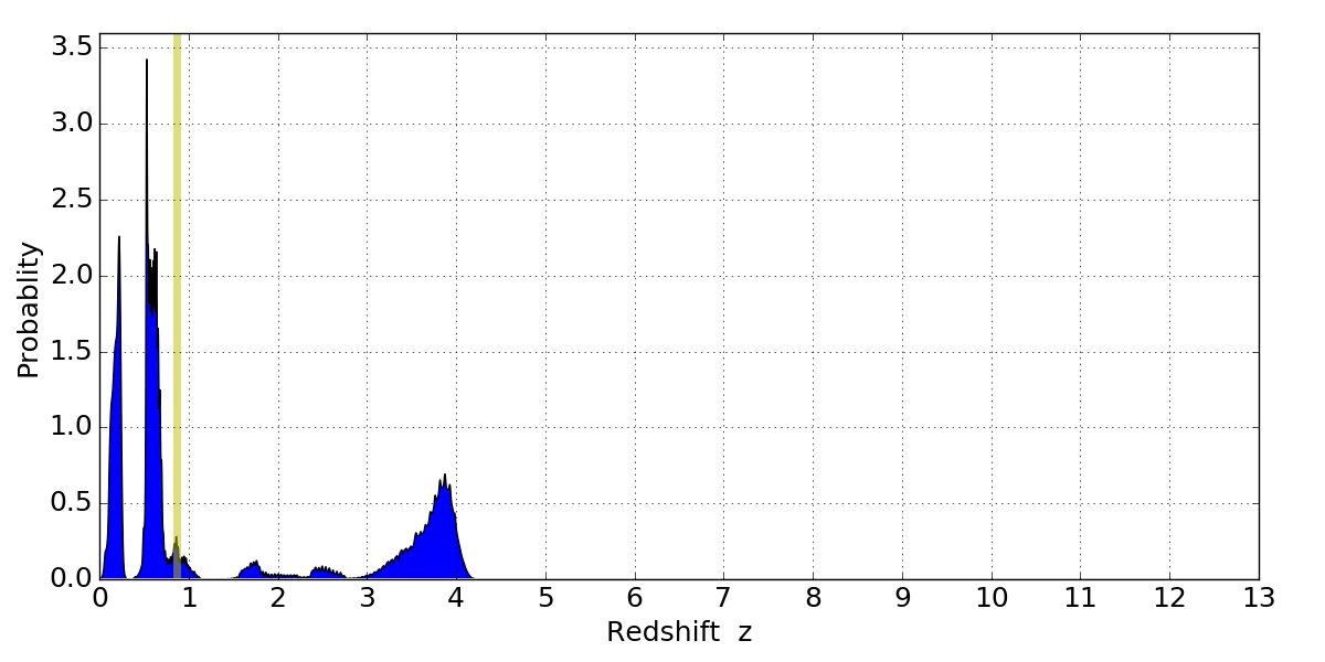 In P(z) plots: Yellow lines mark the cluster redshift z = 0.870,